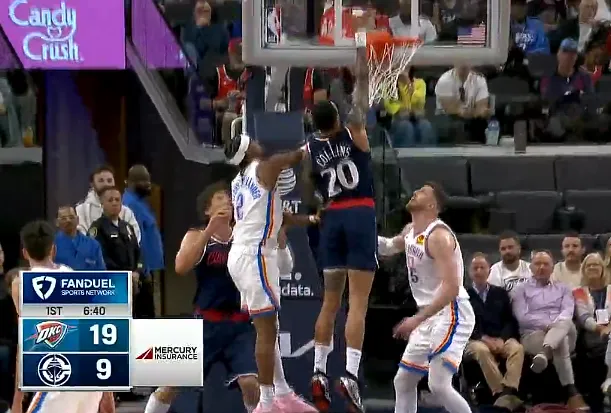 第一节比赛中,霍姆格伦三分投进已经拿到10分,雷霆开局19-9打停快船。